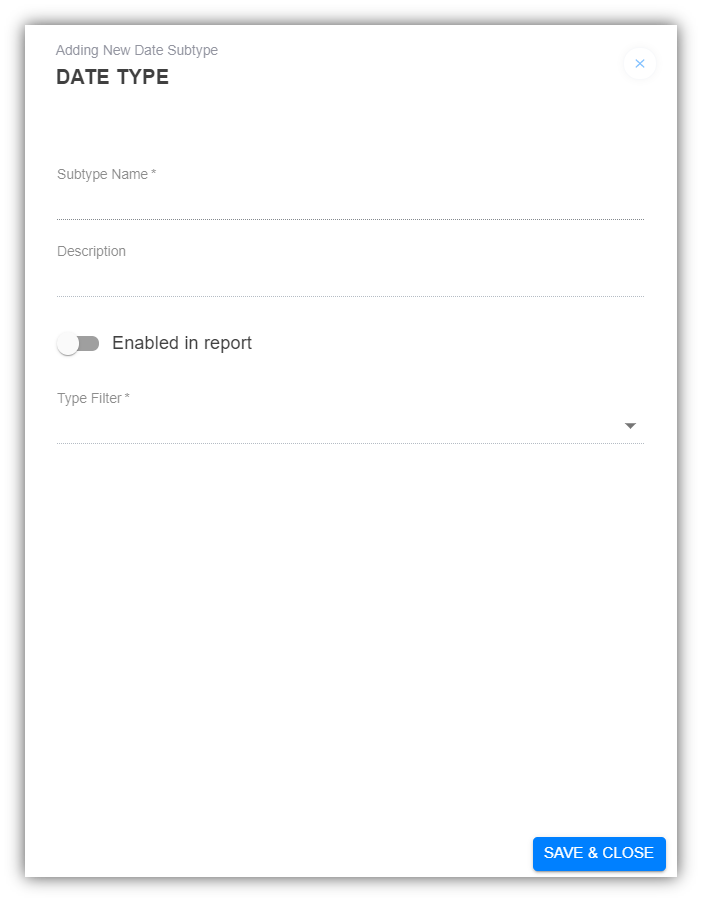 In the pop-up window, add the Date Subtype‘s name, the description, and the filter type.
