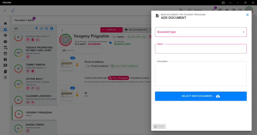 The inclusion of documents in your contacts, entities, or relationships is imperative due to their association with compliance policies. These documents encompass various types and are administratively managed within settings, allowing for the specification of compliance policies, templates, destruction timelines, and other significant dates. This facilitates both the addition and generation of critical documents, essential for monitoring your associates and substantiating the activities surrounding a particular entity.