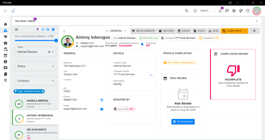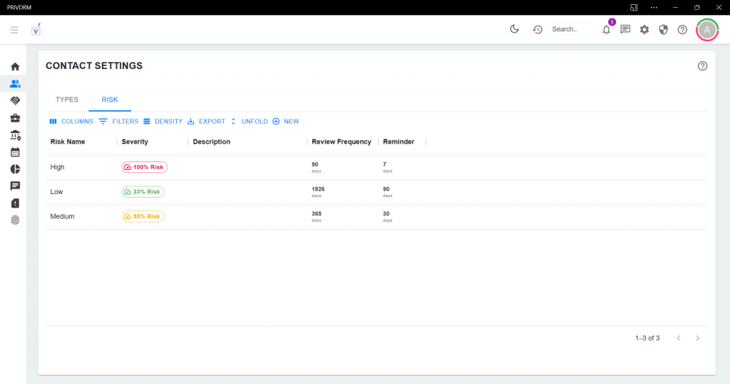 Types of Risk are added in the risk section. Additionally, the review frequency and associated reminders are specified. When you access an individual contact, you can observe the risk calculation process. The risk review, as determined by the specified frequency (or done at any time), is also needed for increasing the compliance level of a specific contact.